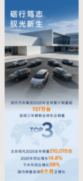 从逆势增长的2025到蓝图清晰的2026,北京现代以战略定力穿越行业周期,以体系韧性夯实发展根基,以品质坚守赢得用户认可。随着“智启2030计划”的持续深化,在产品、技术、市场、服务的多维赋能下,这家合资转型标杆企业正开启全新发展阶段,未来有望在新能源与智能化的赛道上实现更大突破,为中国车市的高质量发展注入更多活力。