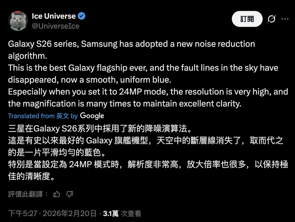 2 月 20 日消息,消息人士 @UniverseIce 今天在 X 平台透露,三星为 Galaxy S26 系列手机升级了全新降噪算法。